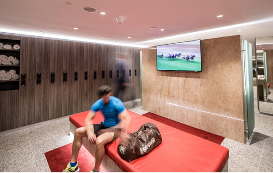 Each shower cubicle has its own private room complete with a full-length mirror, polished stone seat and a splash protected power outlet to charge smartphones and tablets. The change rooms house fresh towels, luxurious leather seating and digital TV screens airing news and weather.